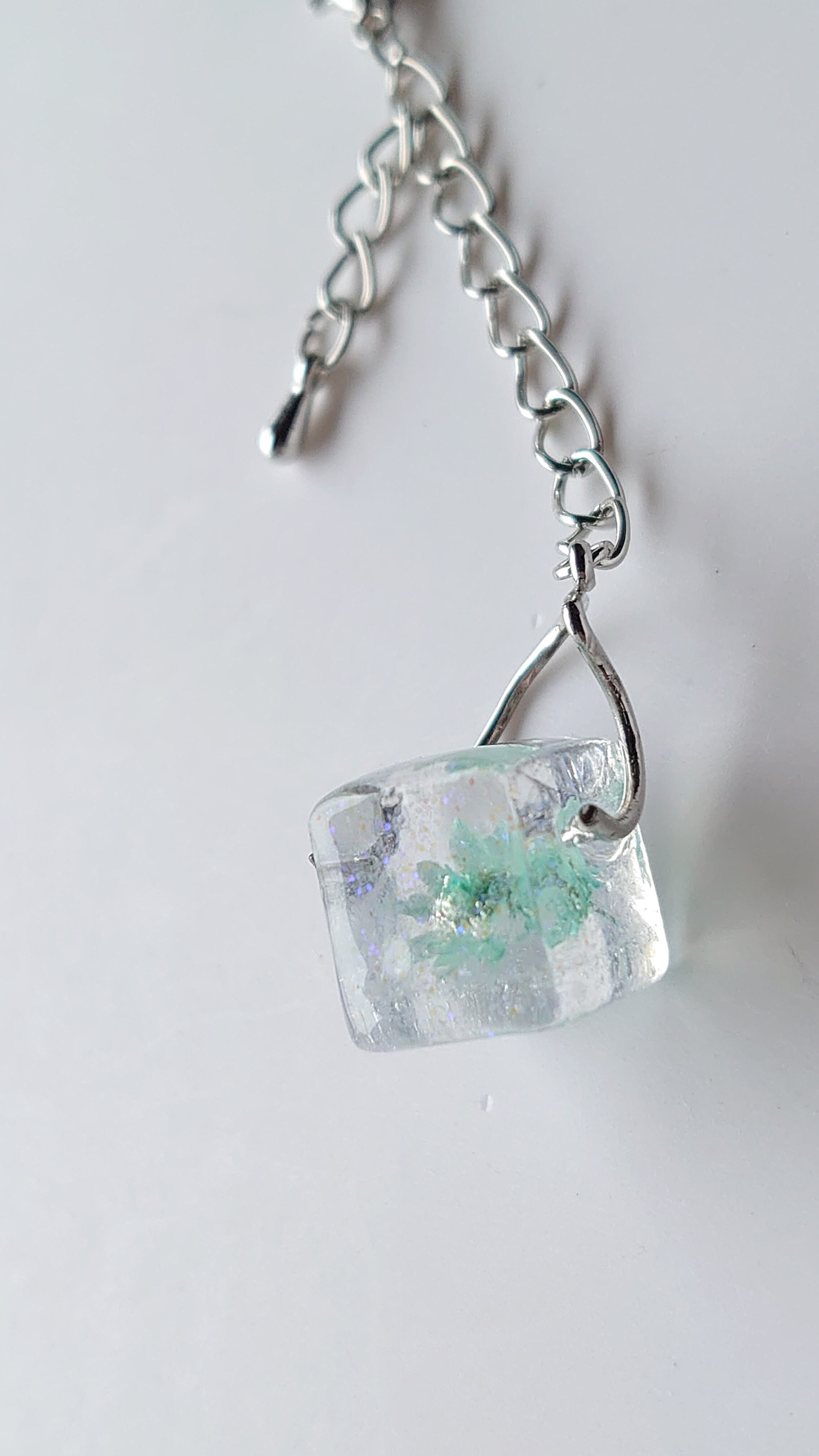 咲いていた花が瞬間的に溶けだしている氷の中に閉じ込められたチャームです。 変わった形のバチカンを使用しています。 シルバーのバチカンは三日月をイメージで制作しています。 長さ = 75mm キューブ 11mmx11mmx11mm 重量 4g ※表面の加工は溶ける氷を表現しています。 ※仕上がり具合により若干サイズに誤差があります。 ※表面をグロス塗装してあるため、アルコールやシンナーで拭くと塗膜がはがれる場合があります。