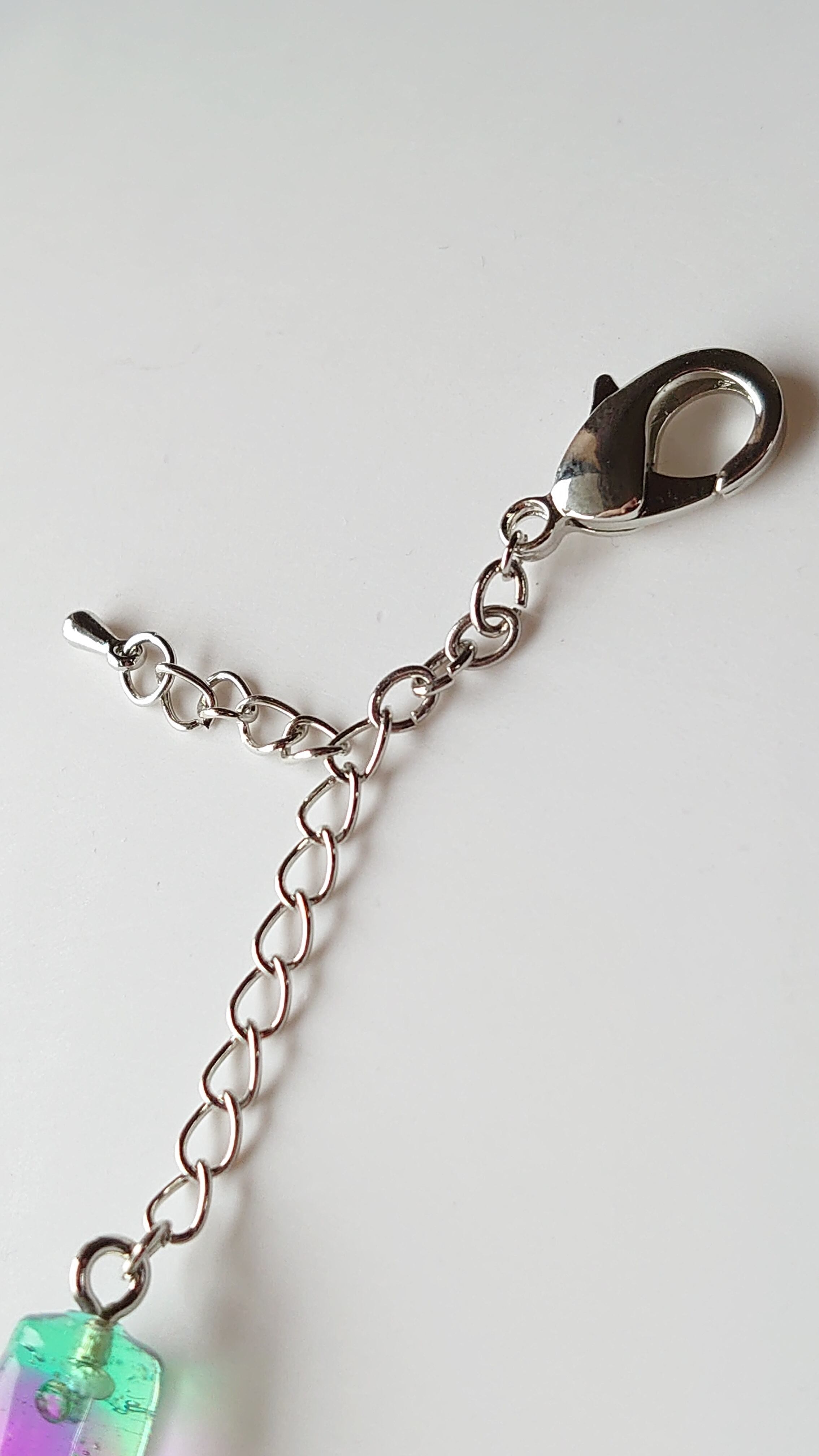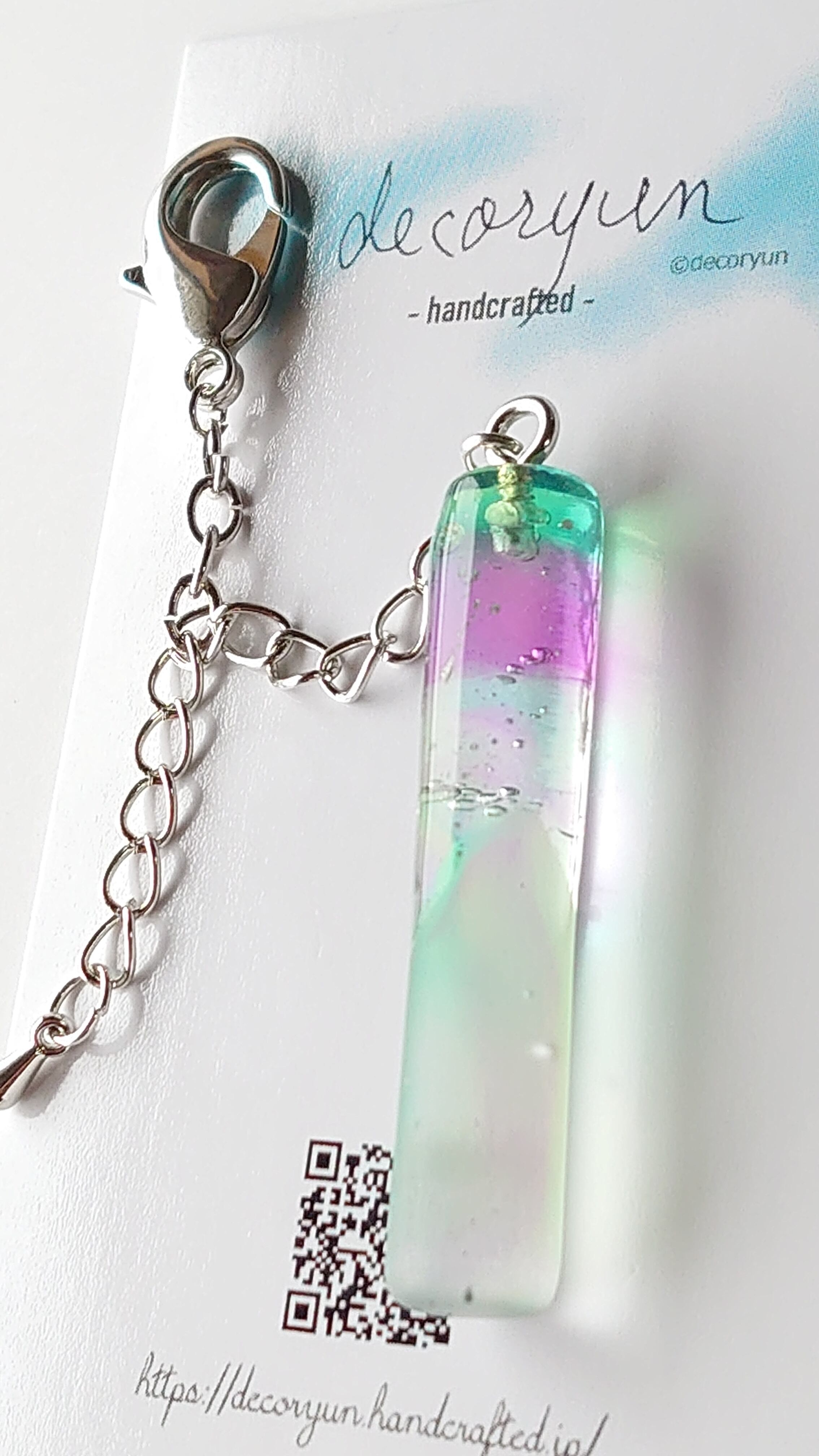 マットな仕上げの上部をクリアにして色をはっきりさせてみました。 状態はマットとクリア、カラーリングは暖色と寒色の双方とも中間色のグリーンとパープル。 「対比」という言葉をモチーフにした作品です。 本体部は、ねじれた円柱です。 ナスカンは一回り大きめです(15mm)。 長さ = 120mm(円柱部 45mm) 重量 = 6g ※仕上がり具合により若干サイズに誤差があります。