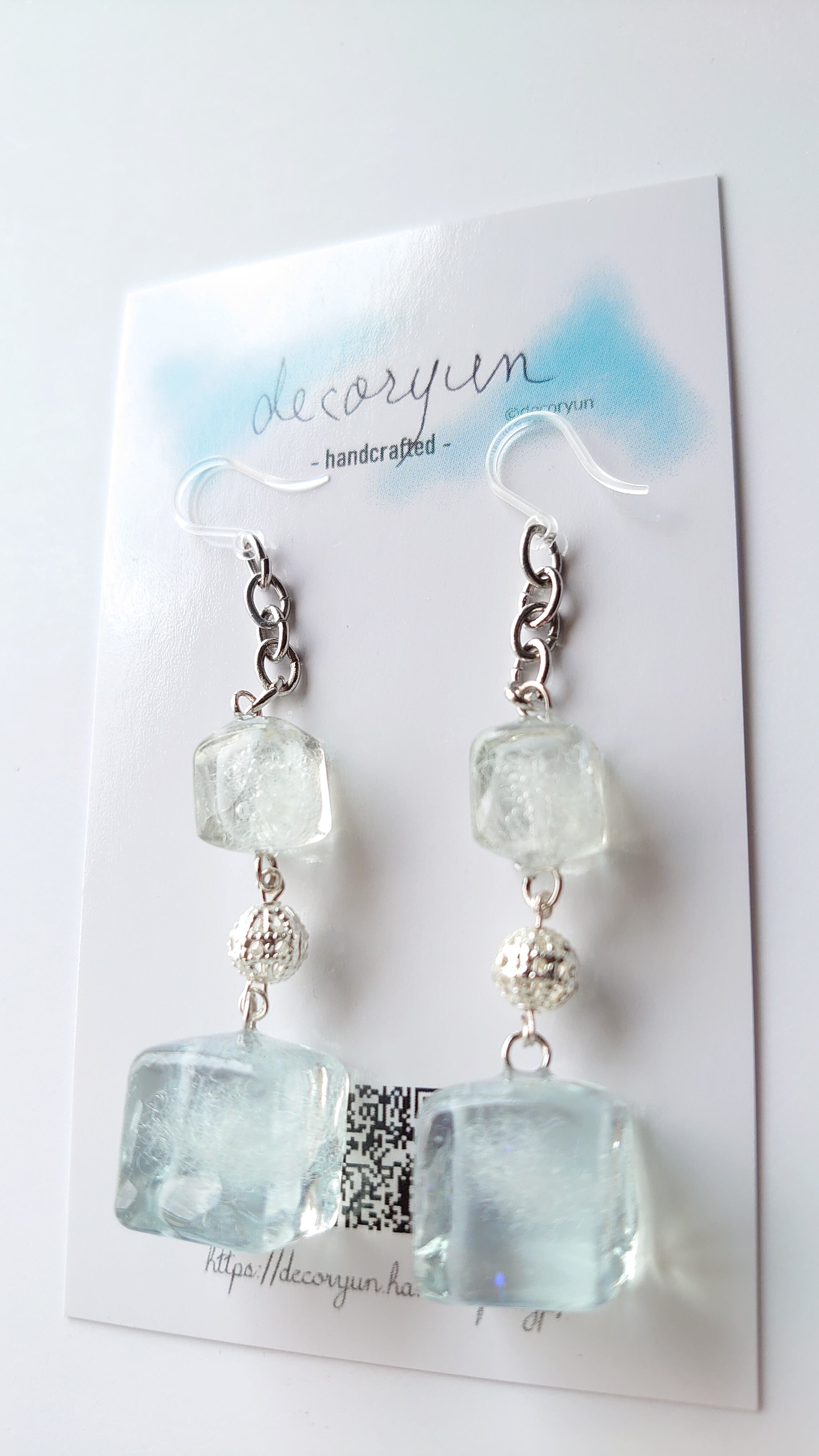 小さいキューブと大きいキューブの間にロンデルボールをあしらったピアスです。