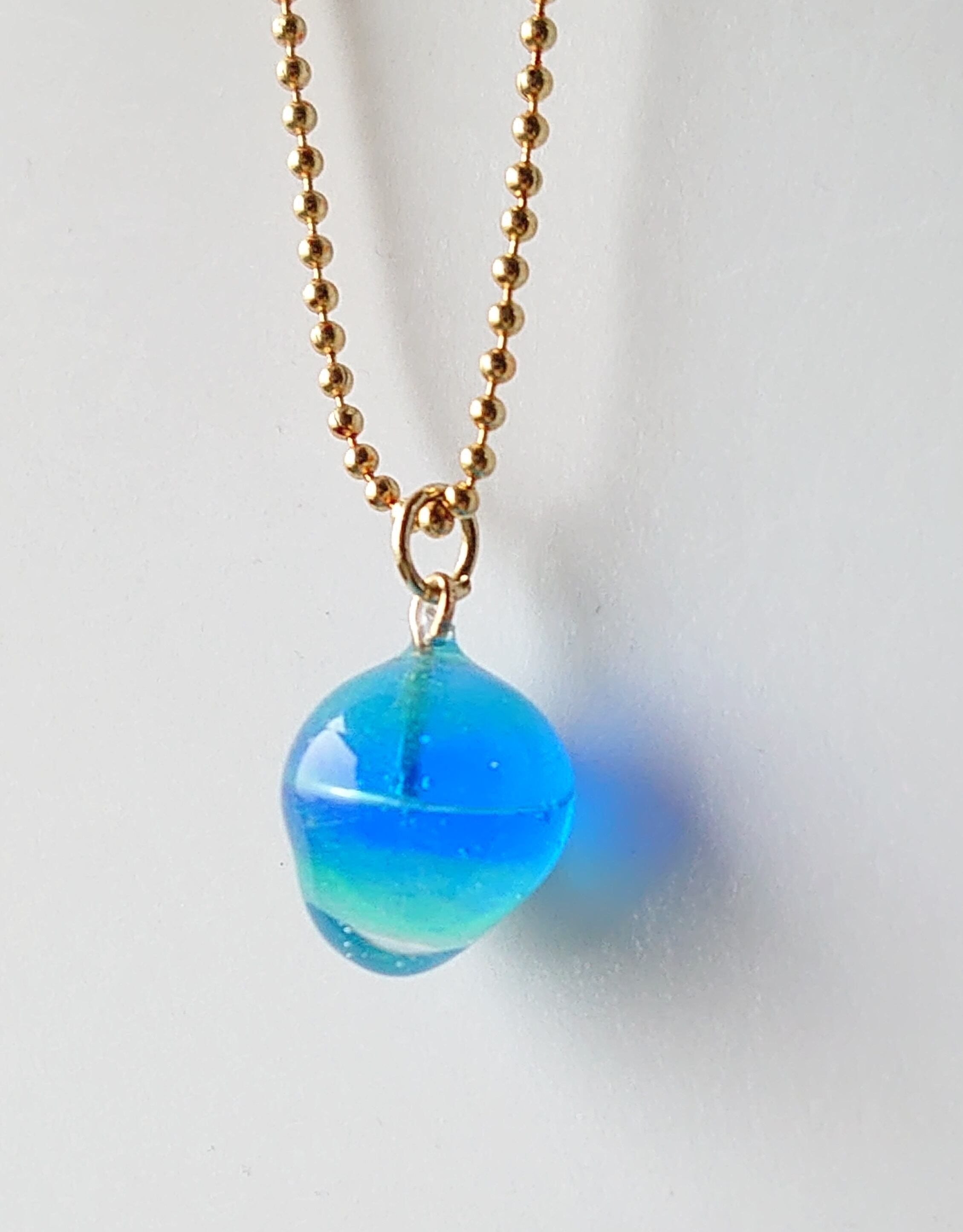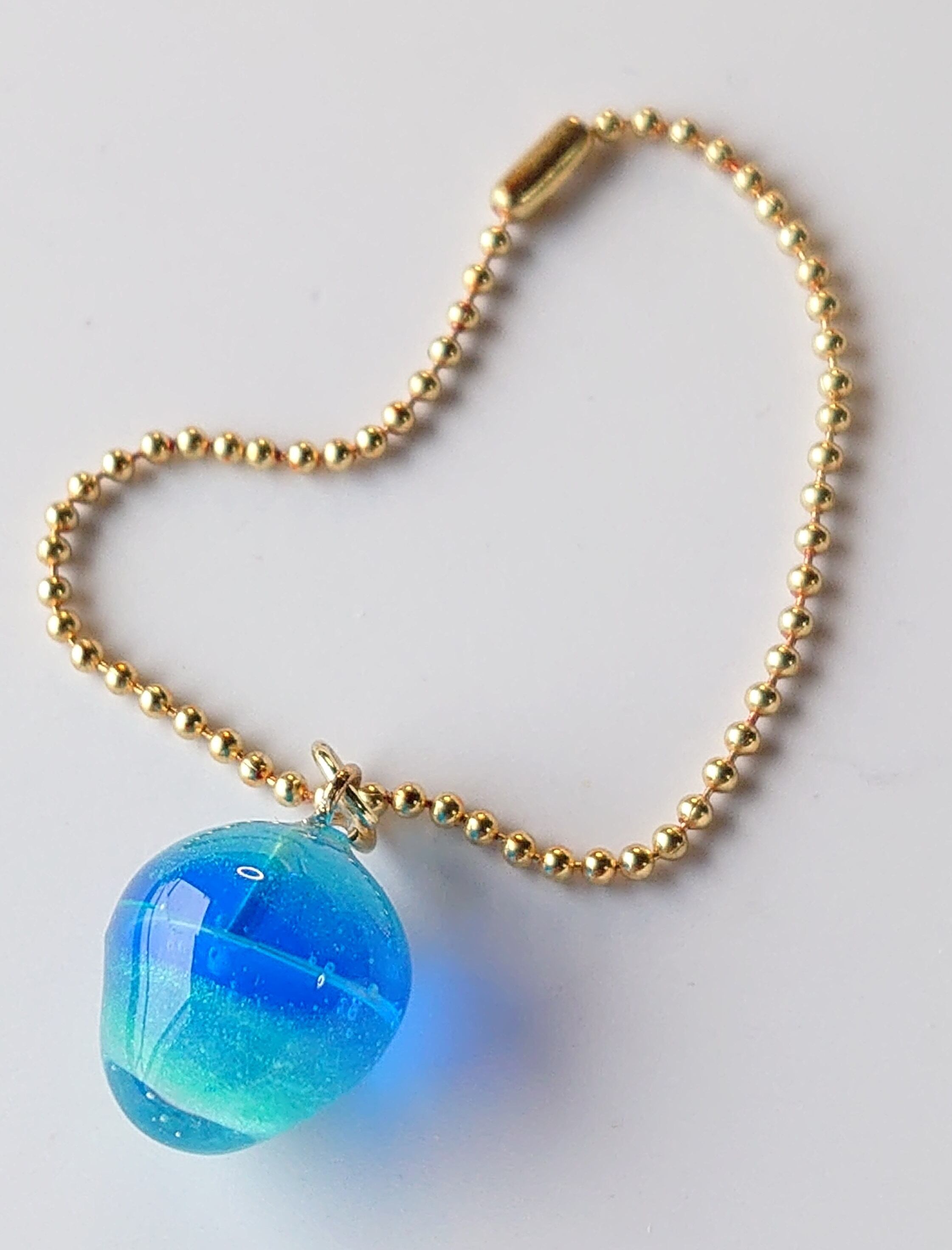 半球を2つをあわせて円にしたのち、青いイチゴのような形に仕上げたチャームです。 青と白のグラデーションと周りのクリアで透明感、みずみずしさをまとっています。 長さ = 75mm(最大) 本体部 = 12mmx10mm 重量 = 2g ※仕上がり具合により若干サイズに誤差があります。