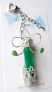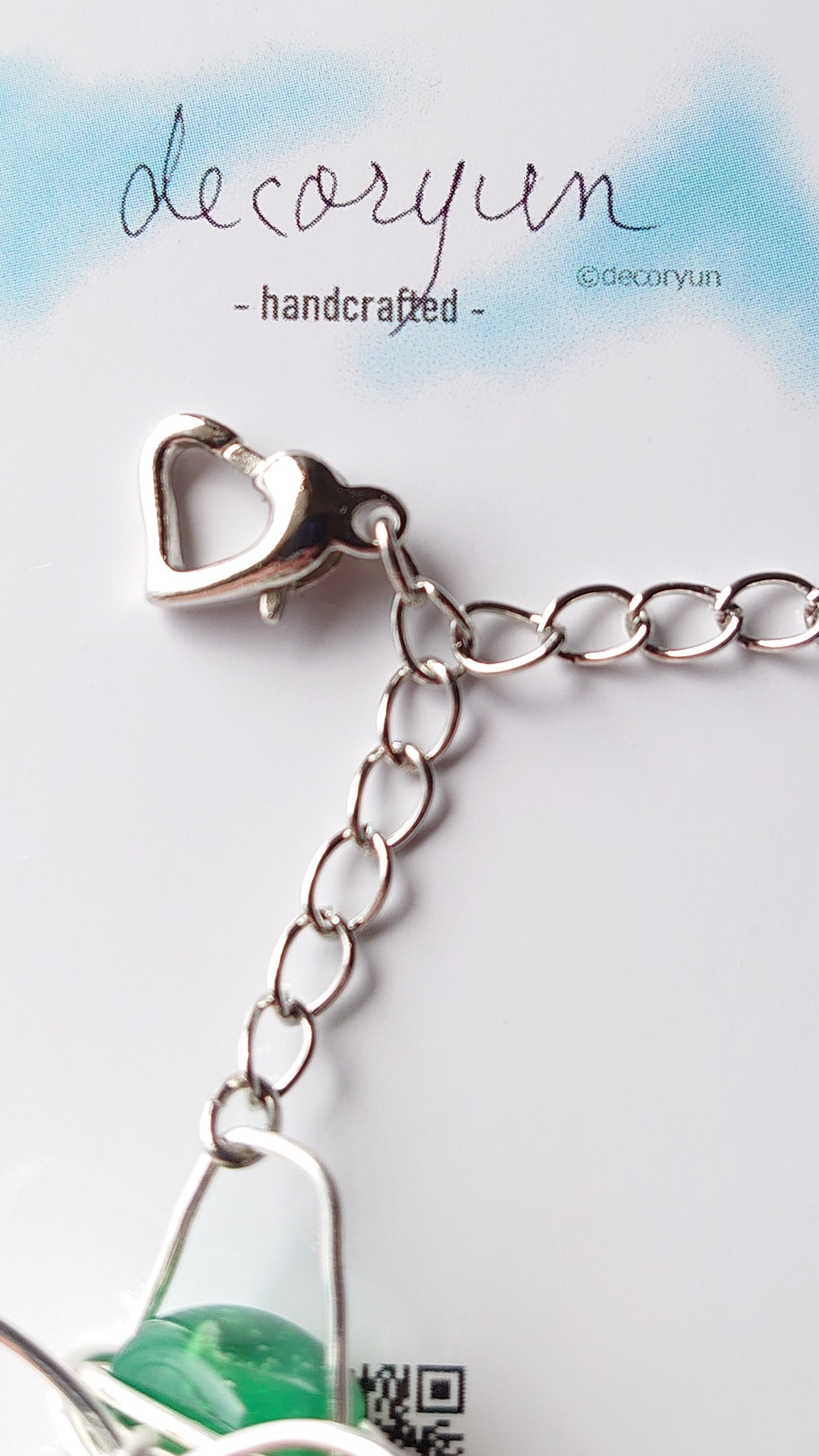 秋冬らしいダークグリーンに透明感をプラスしました。 ワイヤーで好評なリボンをまとい、今回新たにレースを施してさらに上品なエッセンスを加えてみました♪ カニカンはかわいいハート型をチョイス! 長さ = 80mm(最大) 本体部 = 43mm(H)x10x10mm(W) 重量 = 11g ※仕上がり具合により若干サイズに誤差があります。
