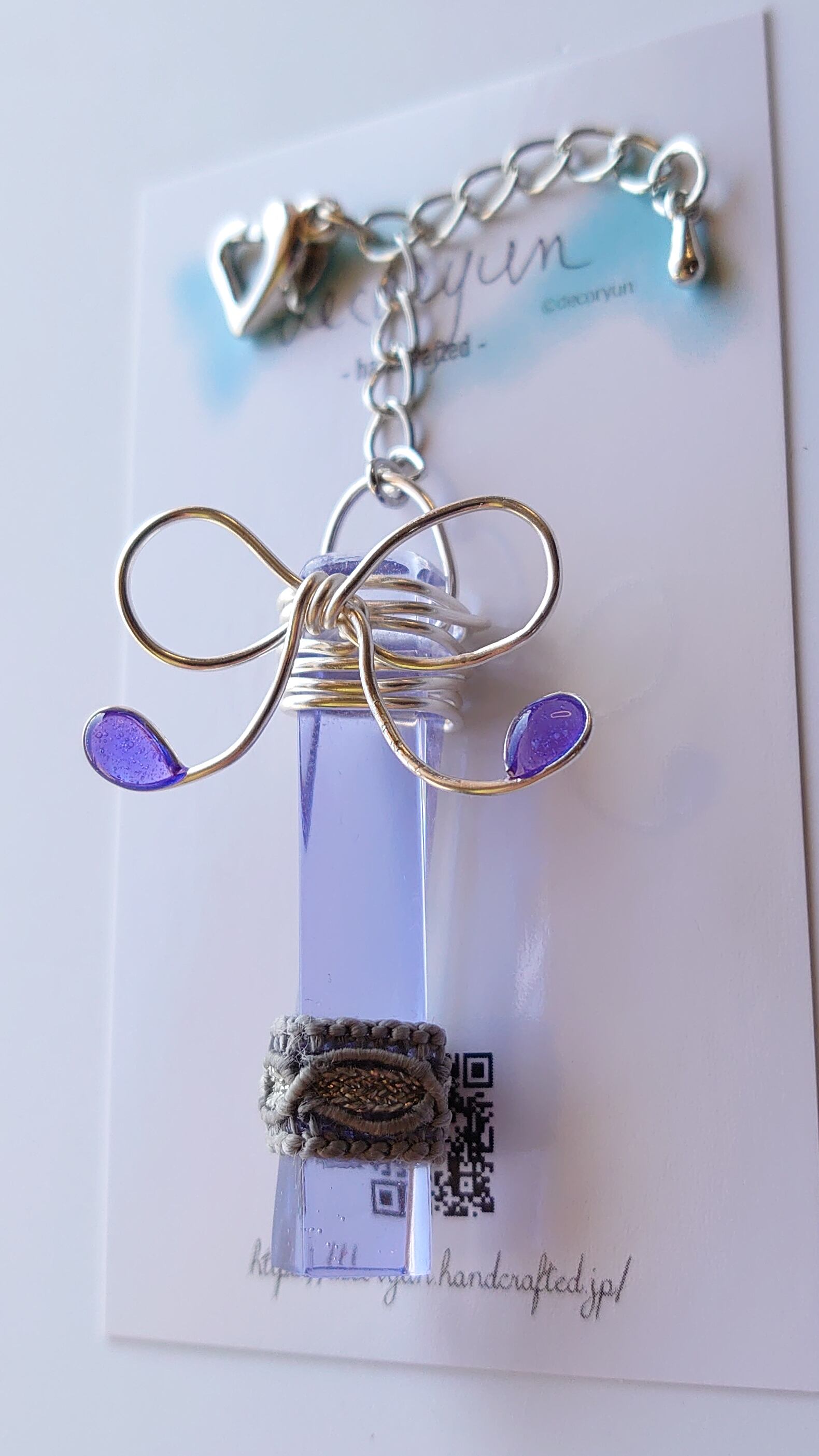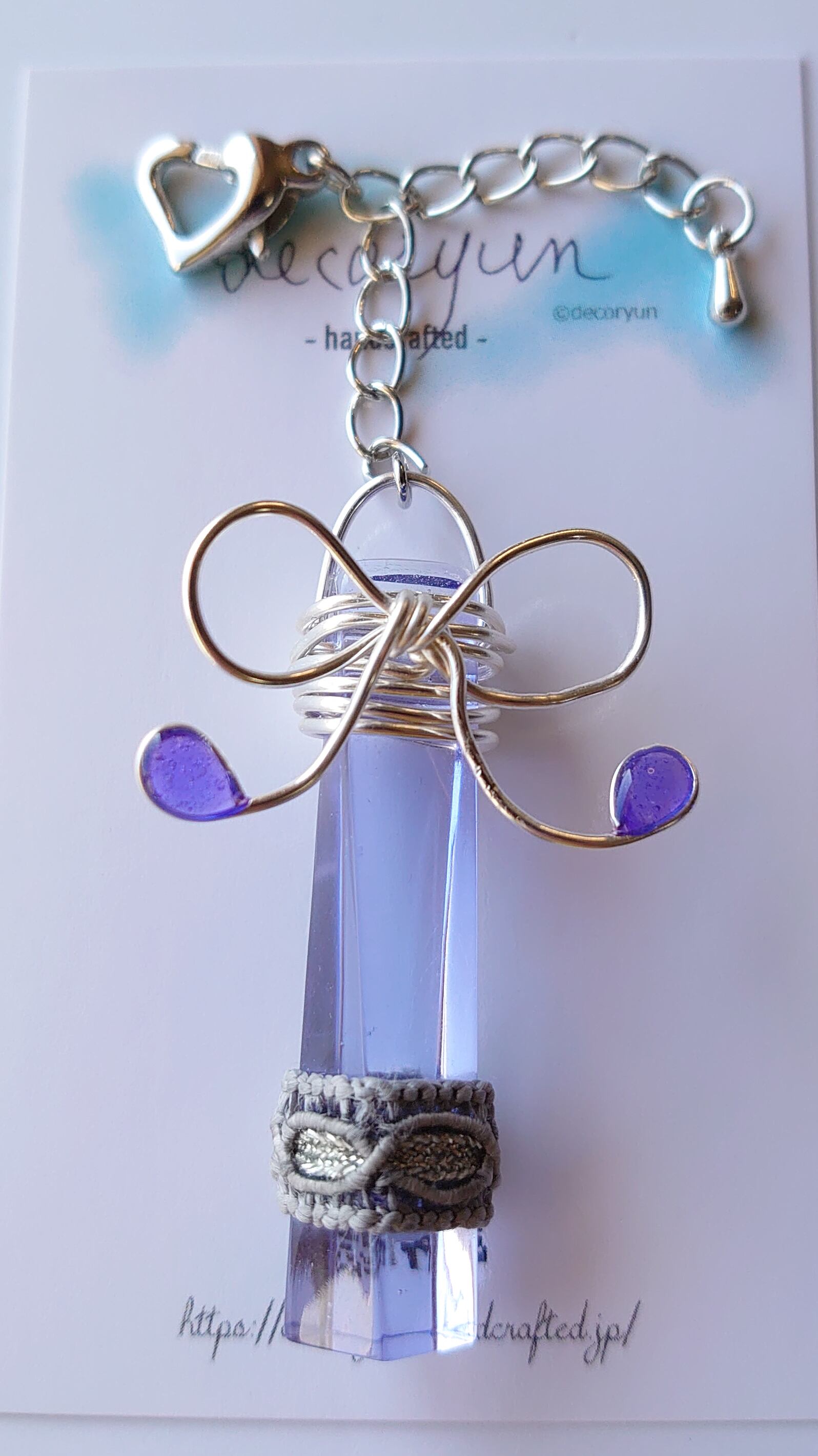 透き通った透明感、そして、高貴な色である紫を若干青めにして、レースを下部に。 ワイヤーで好評なリボンをまとい、さらにカニカンをハート型にすることで可愛らしさもプラスしています。 「クアッドラングラーレースイヤリングClearLightPurple#001」と同じ調色、レースでお揃い感を出しています。 長さ = 80mm(最大) 本体部 = 45mm(H)x10x10mm(W) 重量 = 11g ※仕上がり具合により若干サイズに誤差があります。