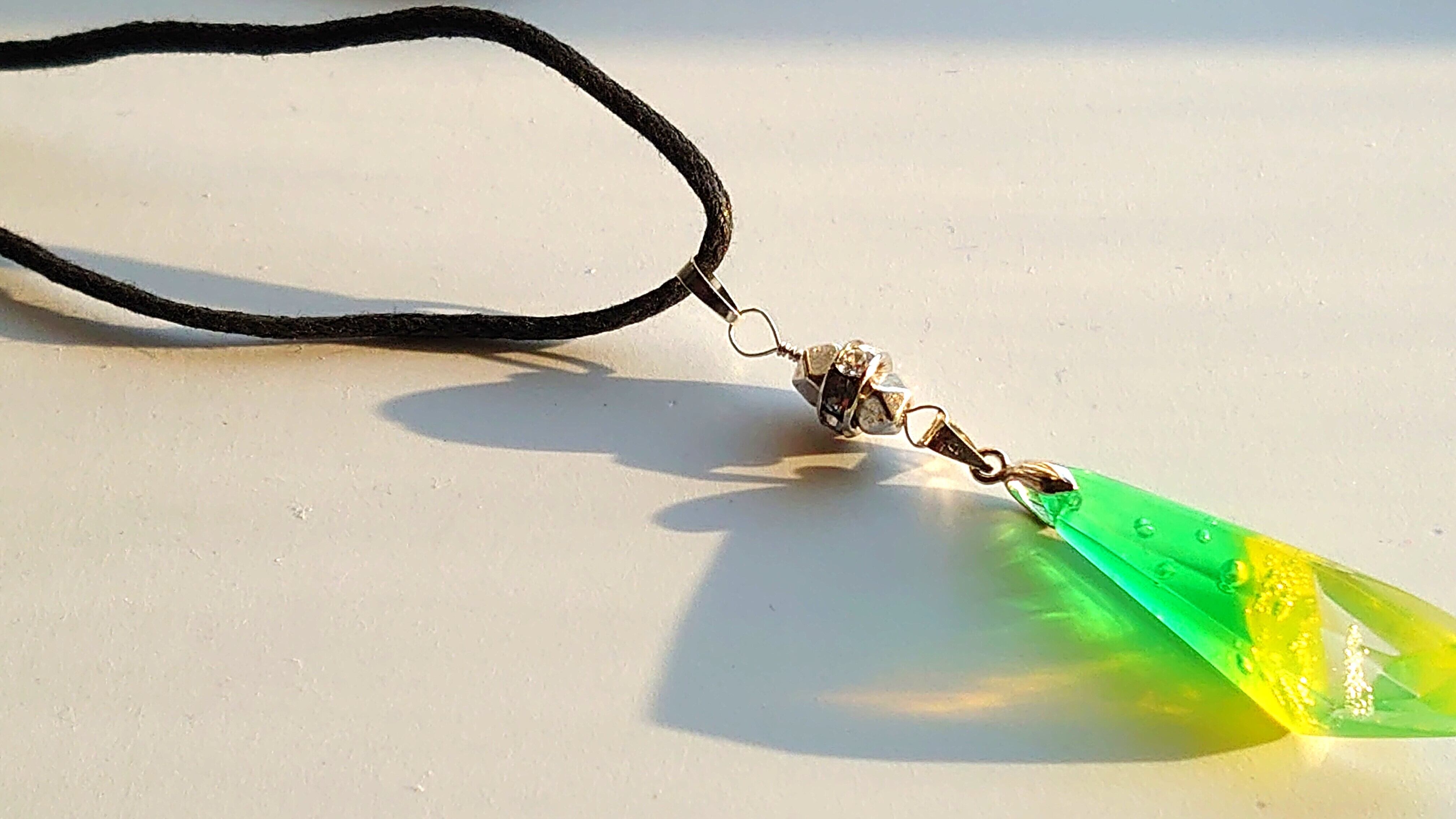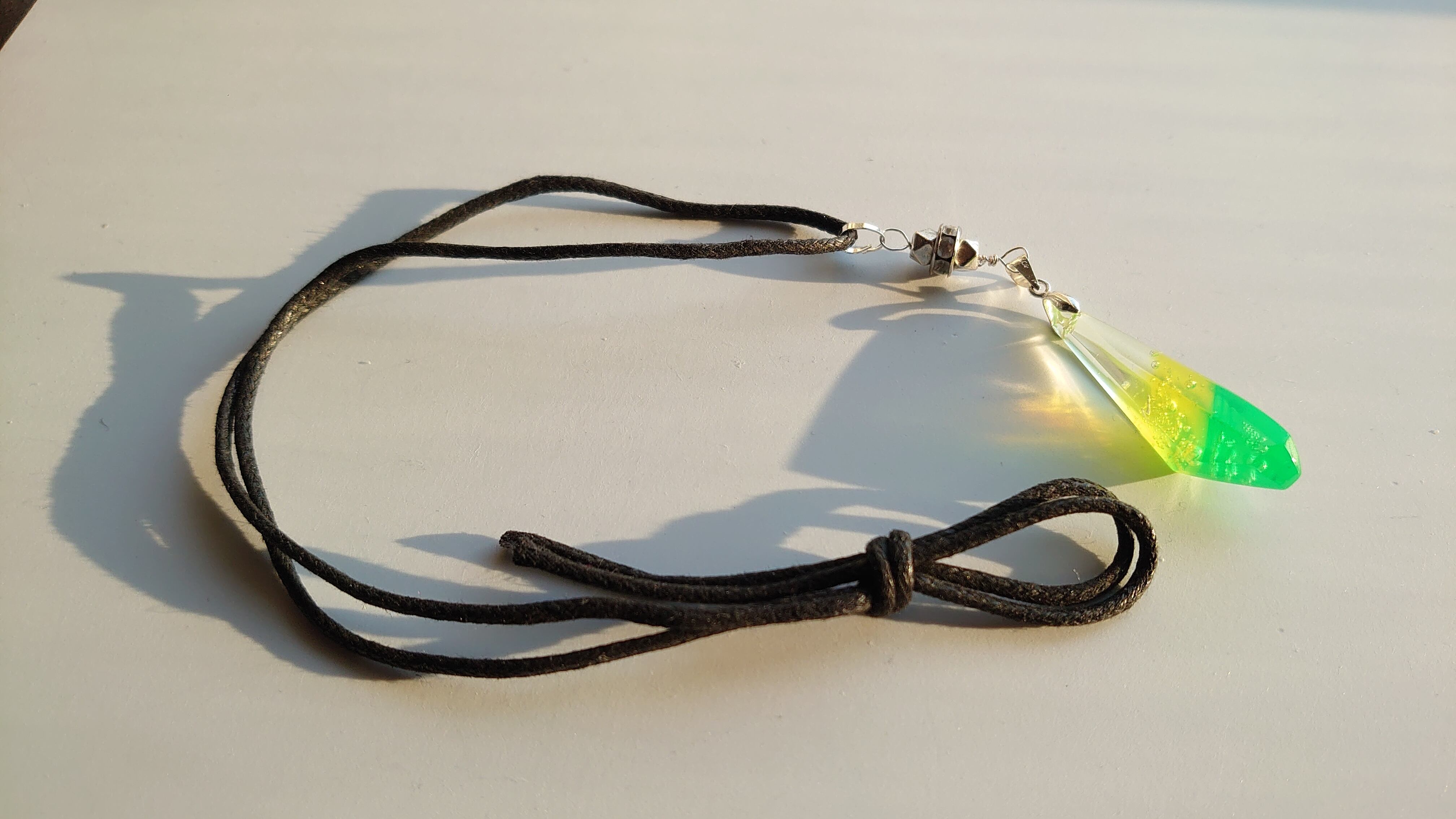 クリア感のあるクリスタルのような感じのチョーカーです。 ペアなんだけど色の配置が反対にしてあります。 間のパーツ、接続パーツも手作りです。 長さ = 30mm 本体部 = 75mm(H)x10mm(W【最大】) ひも = 700~800mm 重量 = 4g ※仕上がり具合により若干サイズに誤差があります。