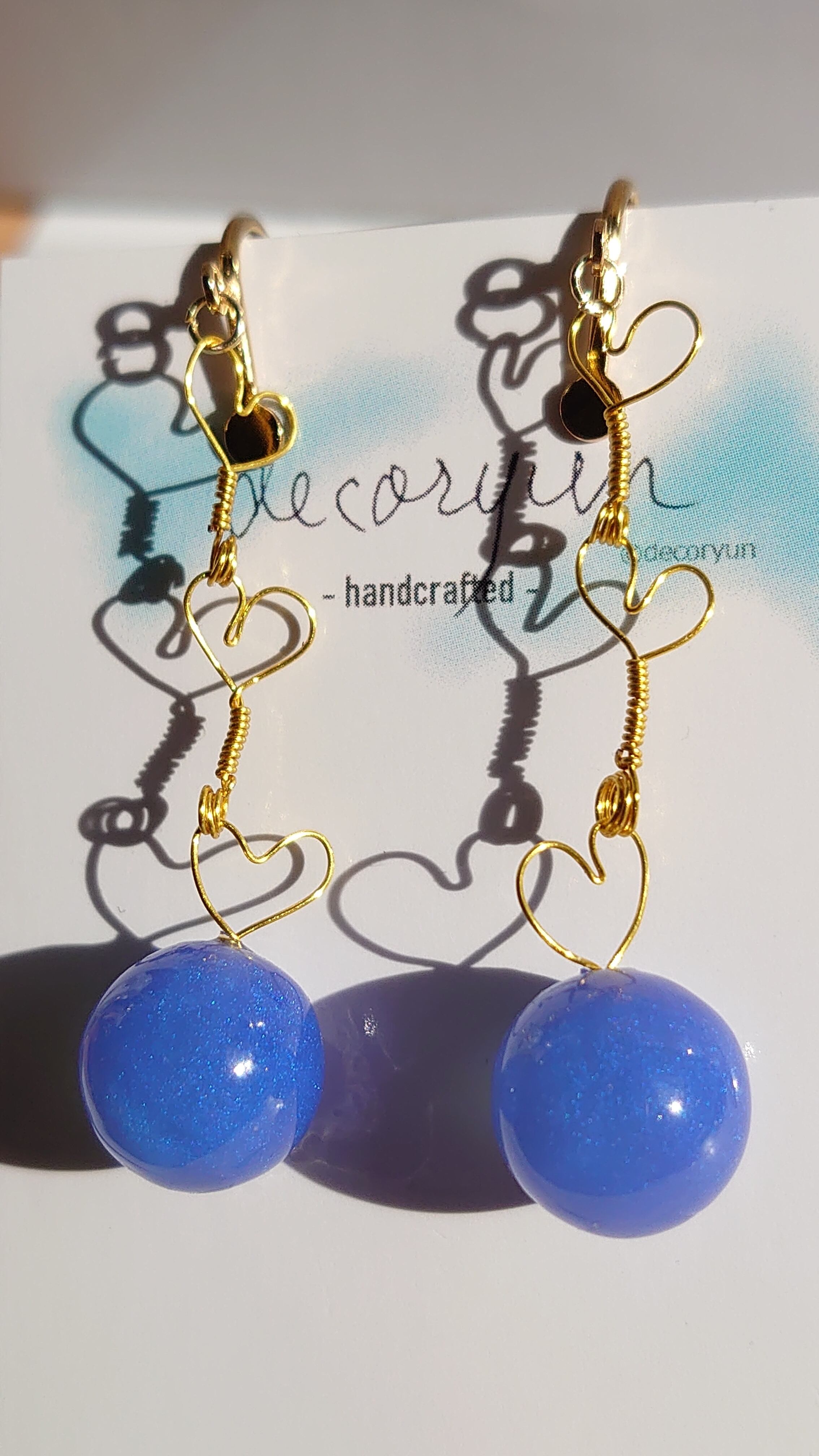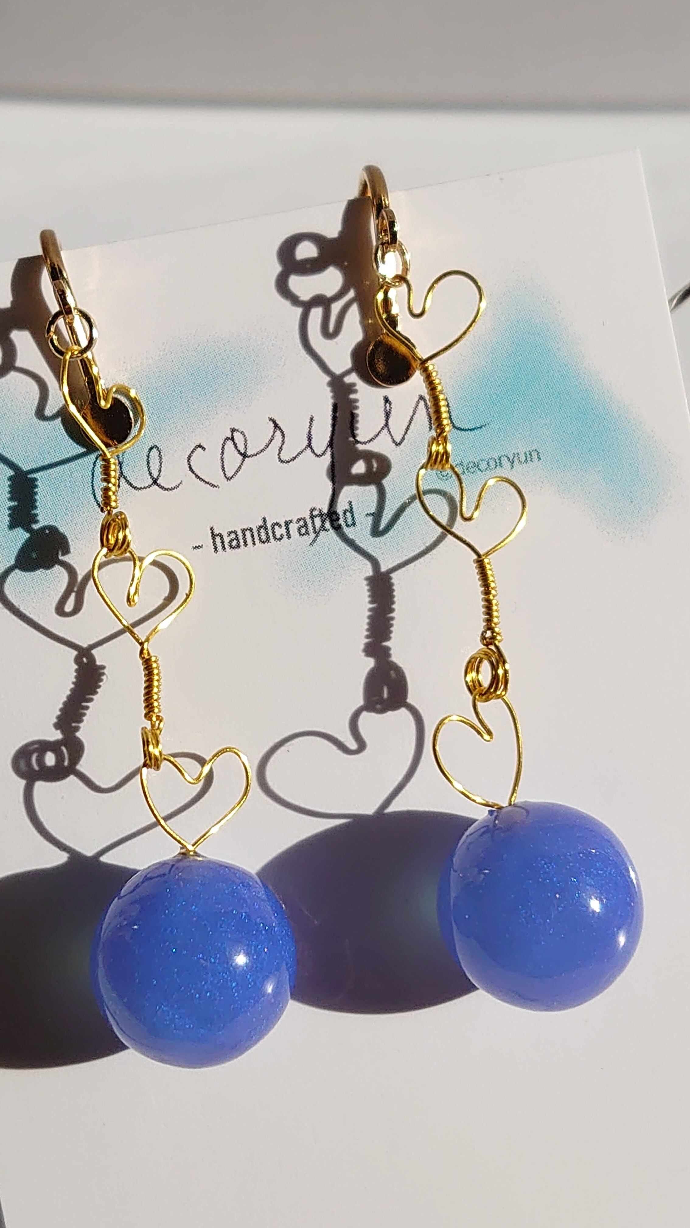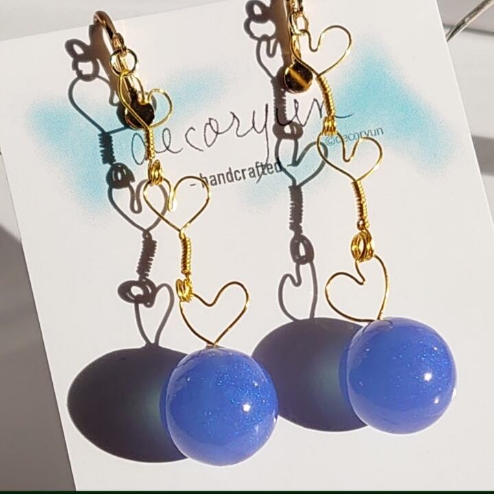まん丸ではない「ぷくっ」とした仕上がりトップに手作りのハートパーツ(ゴールド)をチェーンにしてみた雰囲気のかわいいピアス。 パールブルーを濃い青色基調にして若干紫身を帯びています。 ※この商品は無料オプションでイヤリング、ノンホールピアス、ピアスの金色パーツに変更できます。注文時にオプション選択にて選択してください。 留め金部までの長さ = 50mm(全長 = 60mm) 球体(直径) = 12mm ※仕上がり具合により若干サイズに誤差があります。