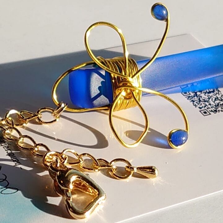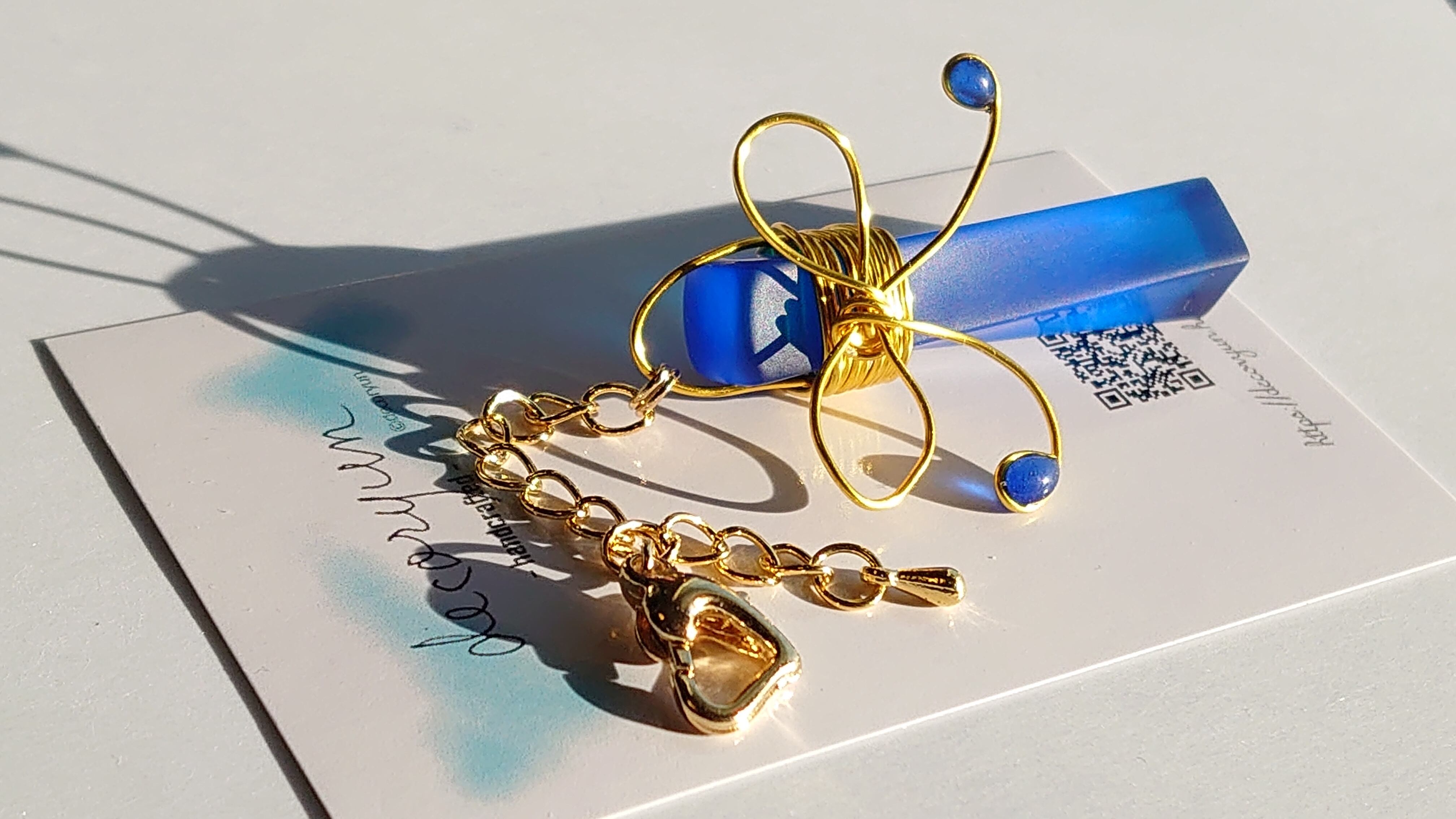 ねじれた四角柱のオリジナルのロイヤルブルーをマット加工にしました。 ゴールドのリボンをあしらうことにより高貴さがアップ! ナスカンもハートを採用しています! 仕上げ加工をよりきめを整えるよう加工工程を変更しましたのでその質感を感じていただけたらと思います。 留め金部までの長さ = 90mm 円錐(1辺x高さ) = 8mm×45mm ※仕上がり具合により若干サイズに誤差があります。