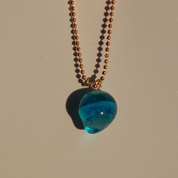 半球を2つをあわせて球体にしたのち、青いイチゴのようなぷっくりとしたしずく形に仕上げたチャームです。 明るめ青とパールグリーンのグラデーションと周りのクリアで透明感、みずみずしさをまとっています。 かなり明るめです♬︎ 長さ = 75mm(最大) 本体部 = 12mmx10mm 重量 = 2g ※仕上がり具合により若干サイズに誤差があります。