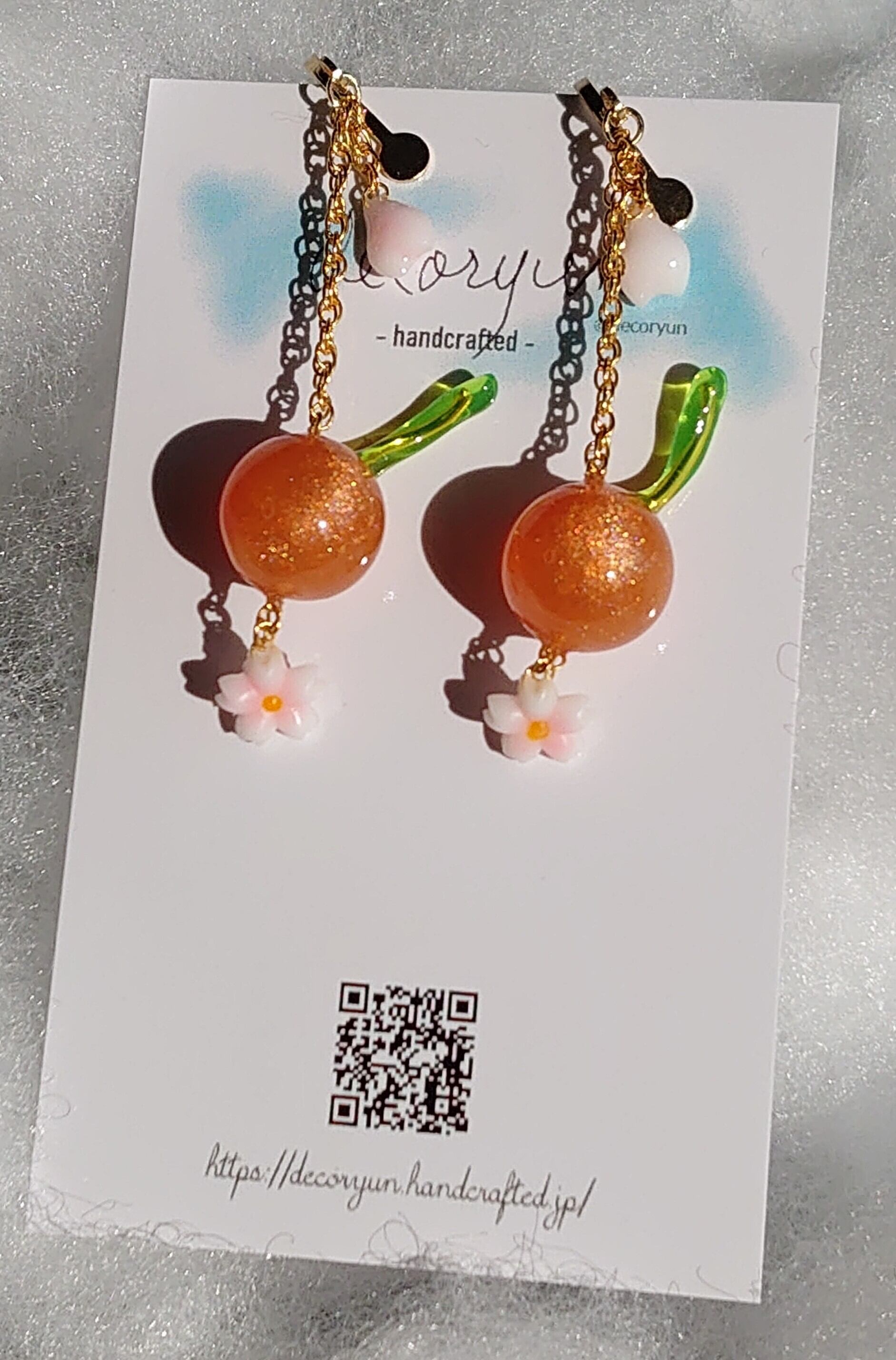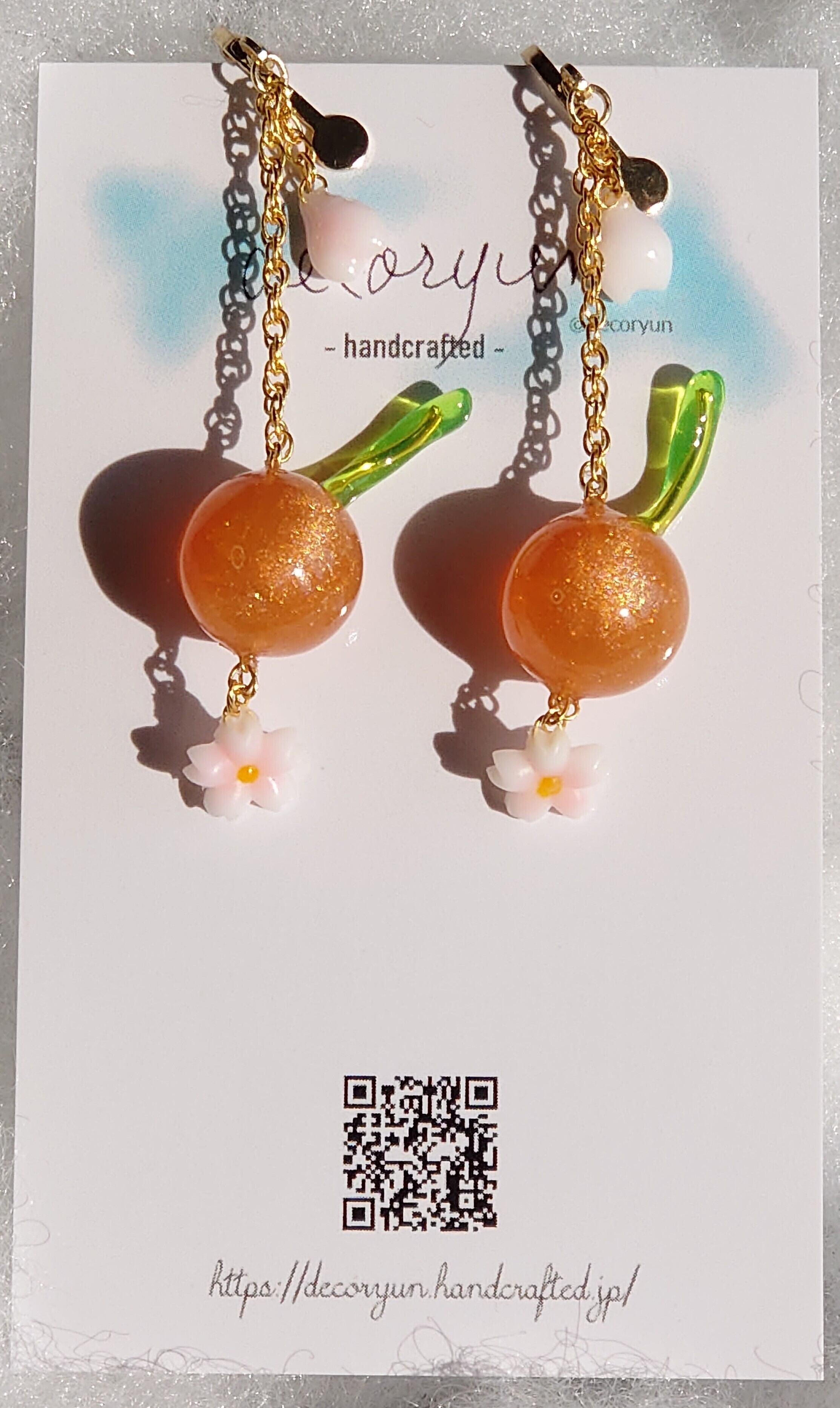 さくらんぼと春をイメージしたオレンジのチェリーチャームイヤリングです。 イエローにパールのピンクベージュを混ぜてちょっとキラキラするようにしてます♬ 明るめのグリーンの枝も印象的! ※この商品は無料オプションでイヤリング、ノンホールピアス、ピアス、パートチャームの金色パーツに変更できます。注文時にオプション選択にて選択してください。 全長 = 50mm さくらんぼの球体 = 12mm 重量 = 3g ※仕上がり具合により若干サイズに誤差があります。
