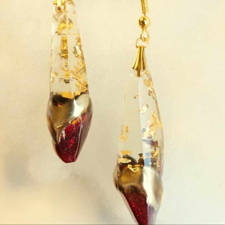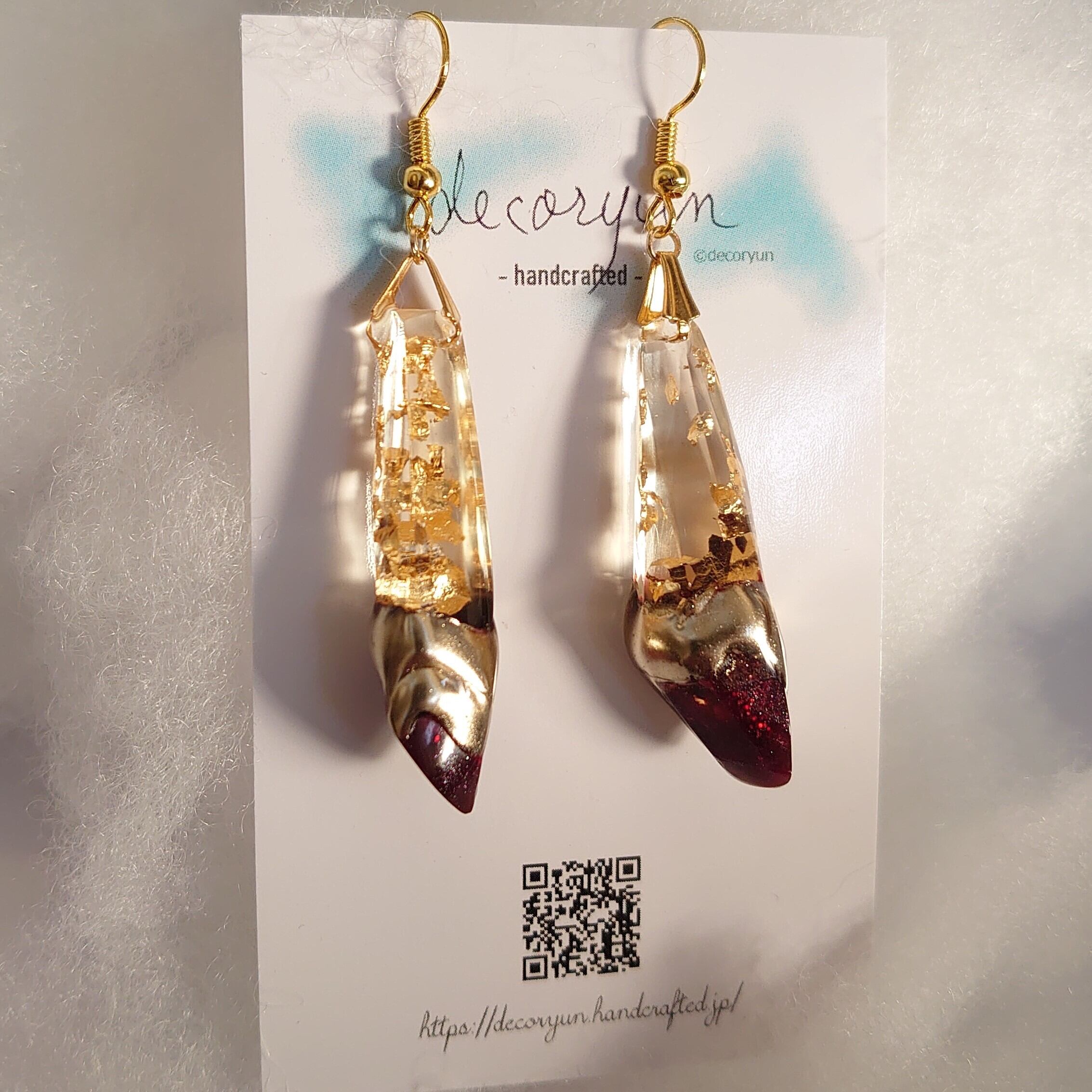 落ち着いたえんじに高貴なメタリックゴールドを金属を塗ったようにぷっくりと仕上げました。 クリアの中の金箔があなたの中の雅やかさをアップ! 左右の形、大きさをちょっとだけ変更して気づかない程度のアシメ♪ ※この商品は無料オプションでイヤリング、ノンホールピアス、ピアス、パートチャームの金色パーツに変更できます。注文時にオプション選択にて選択してください。 全長 = 45mm 重量 = 4g ※仕上がり具合により若干サイズに誤差があります。