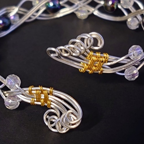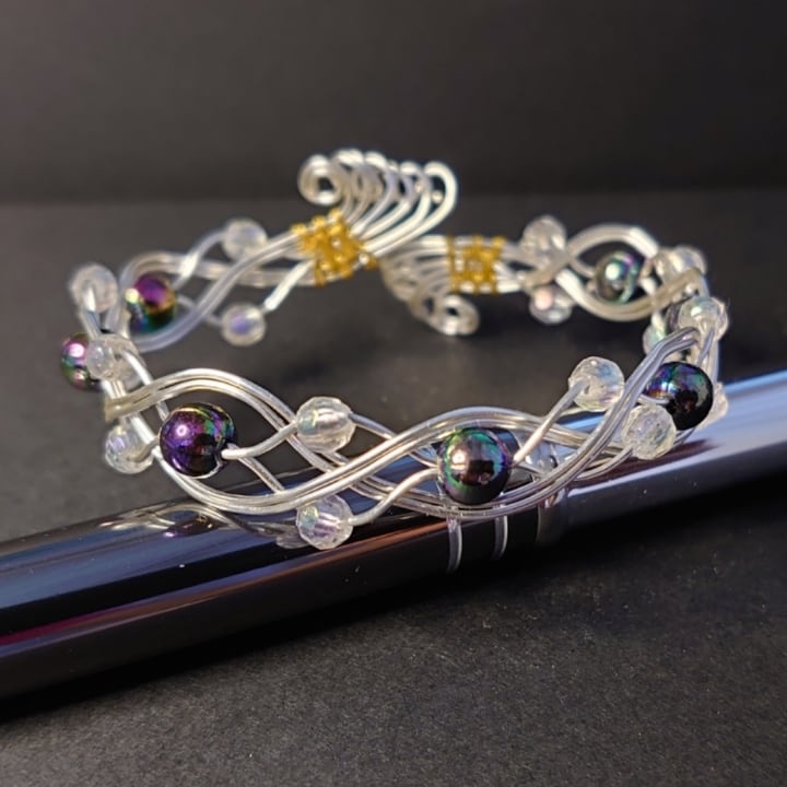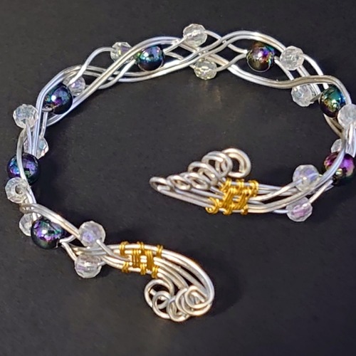 上下2本ラインのワイヤーの真ん中に2本クロスさせながら編み込んだワイヤーブレスレットです。 緑か紫か見る方向によって違う玉虫色のビーズをメインに キラキラするカットビーズを間の上下2ヶ所に配置! 光の方向で見える色が変わる変幻自在を表しています。 手首部分は両端を反対方向に外巻きにしてアシンメトリーに! 全長 = 180mm(手首側はアシメなのでずらしてつけるのもおしゃれです) 重量 = 7g ※仕上がり具合により若干サイズに誤差があります。