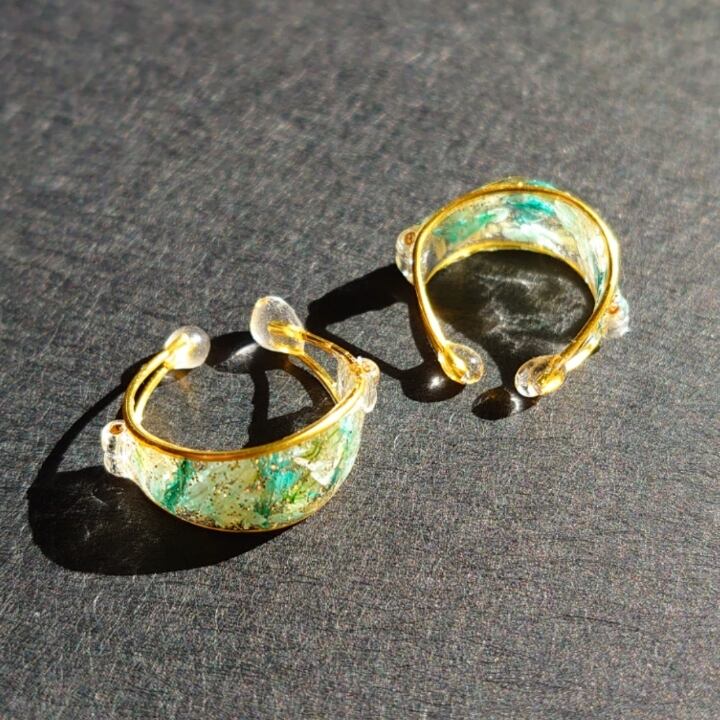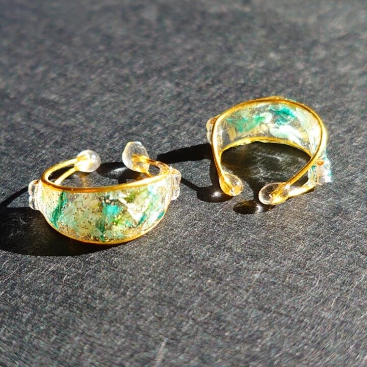 涼しげな3種のグリーンの花びらを透明のレジンであしらったイヤーカフです。 ゴールドとグリーンの色合い、そして透明感はピカイチです! 耳に触れる部分は、柔らかいグミレジンを使用しています。 ※強い衝撃を与えると破損の原因となりますのでお取扱いにご注意ください。 ゆっくりまげていくぶんに関しては問題ないと思います。 球体直径 = 12mm 重量 = 1g ※仕上がり具合により若干サイズに誤差があります。