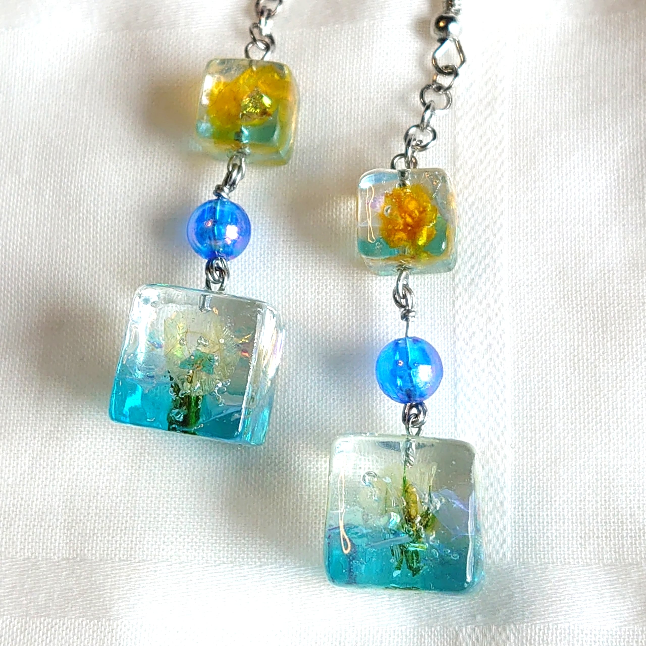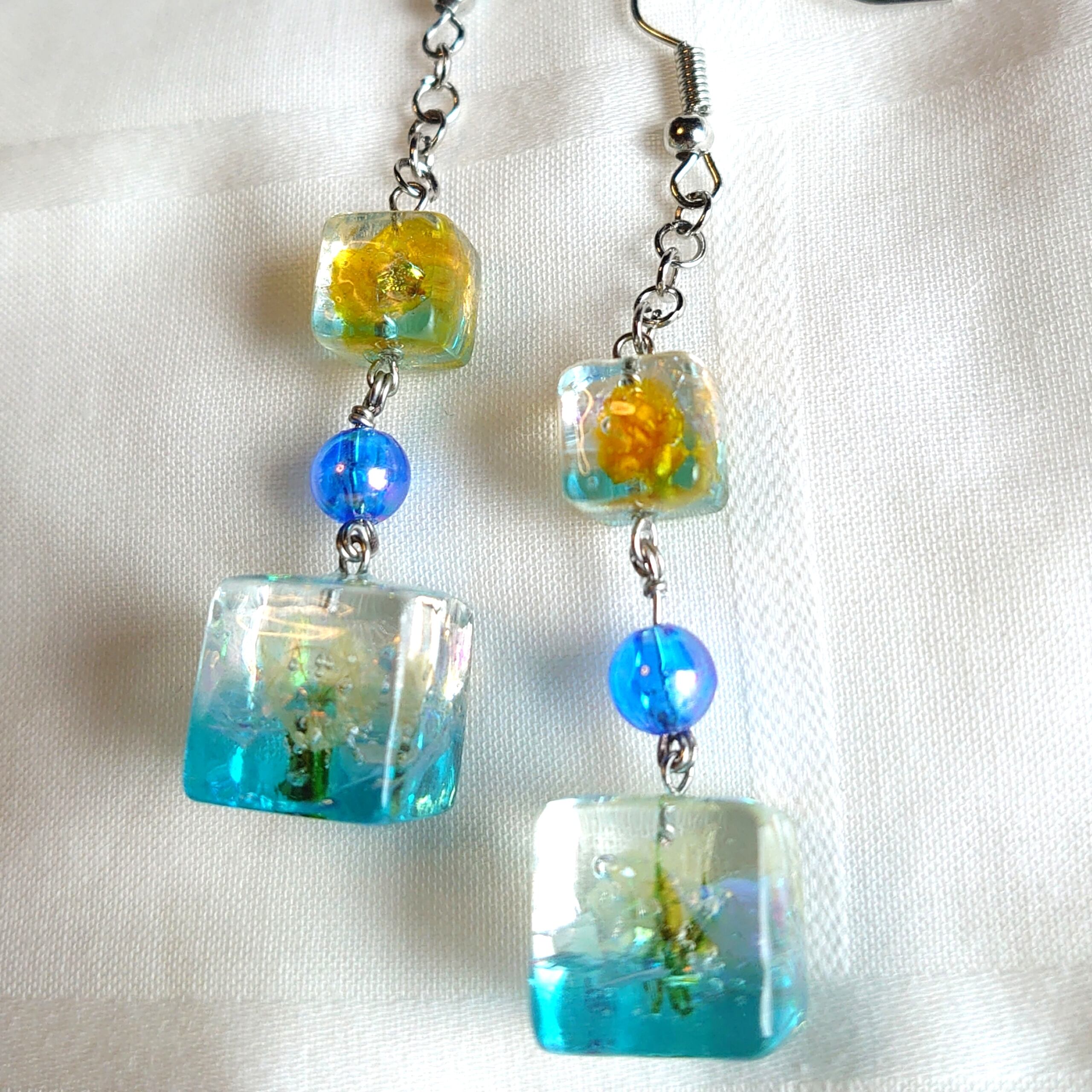 小さいキューブと大きいキューブの間にブルーのきらきらしたビーズをあしらったピアスです。