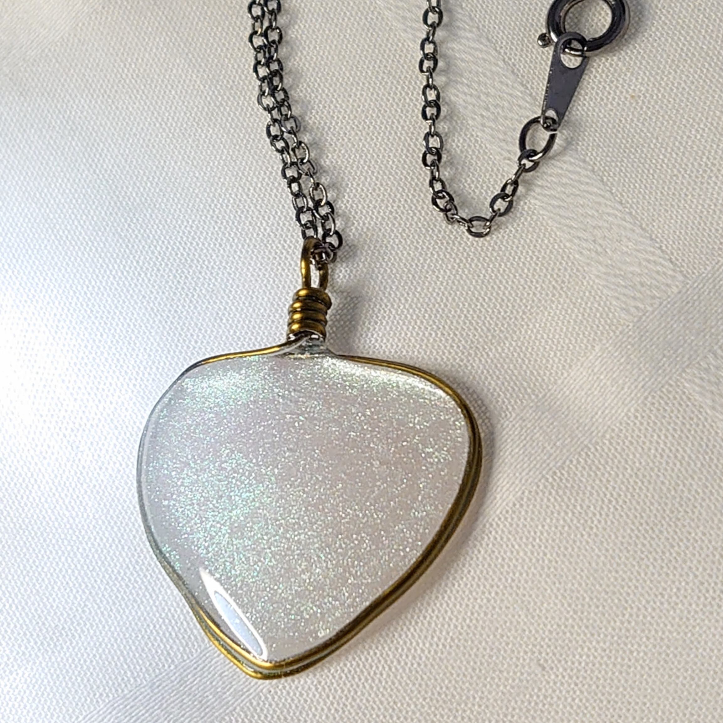 こちらの商品はパープル系の偏光はなしにして白とグリーンのシンプルさを込めました。シンプルな服でも胸元にキラキラ光るアクセントがオススメです!