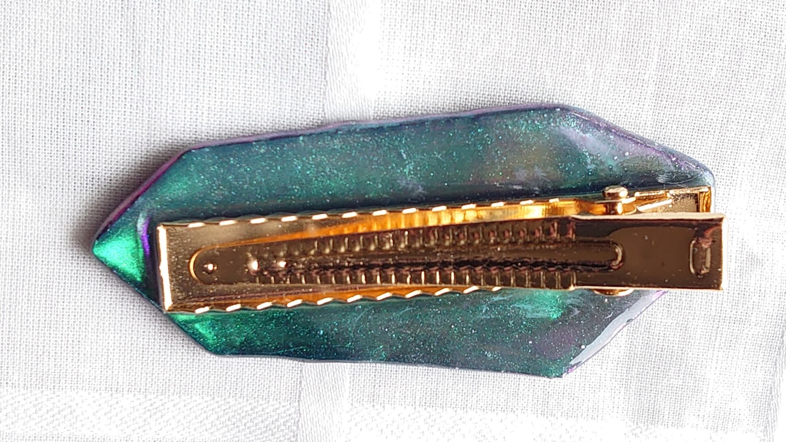光の当たり方で色味が変わってくるバレッタです。 グリーンがピンクになったりブルーがパープルになったりイエローがグリーンになったり… 色が重なっている部分もまた変化あり! 変則な7角形も個性的でアクセントになり、ブルーを基調としているので落ち着きも演出してくれます。 本体部 = 30mm(H)x70mm(W)(最大長) 重量 = 10g クリップ 金色 ※仕上がり具合により若干サイズに誤差があります。