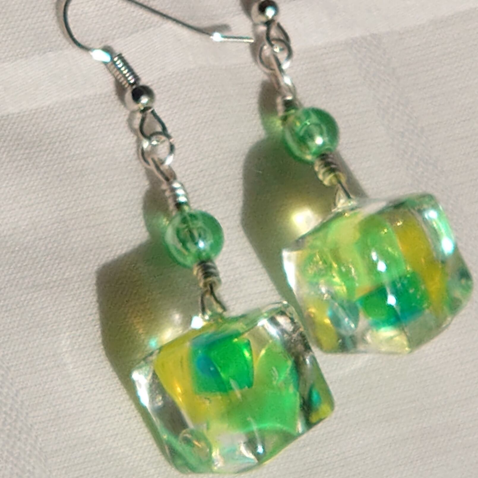 黄緑青の極小のキューブをクリアなキューブに閉じ込めたちょっとピアス。