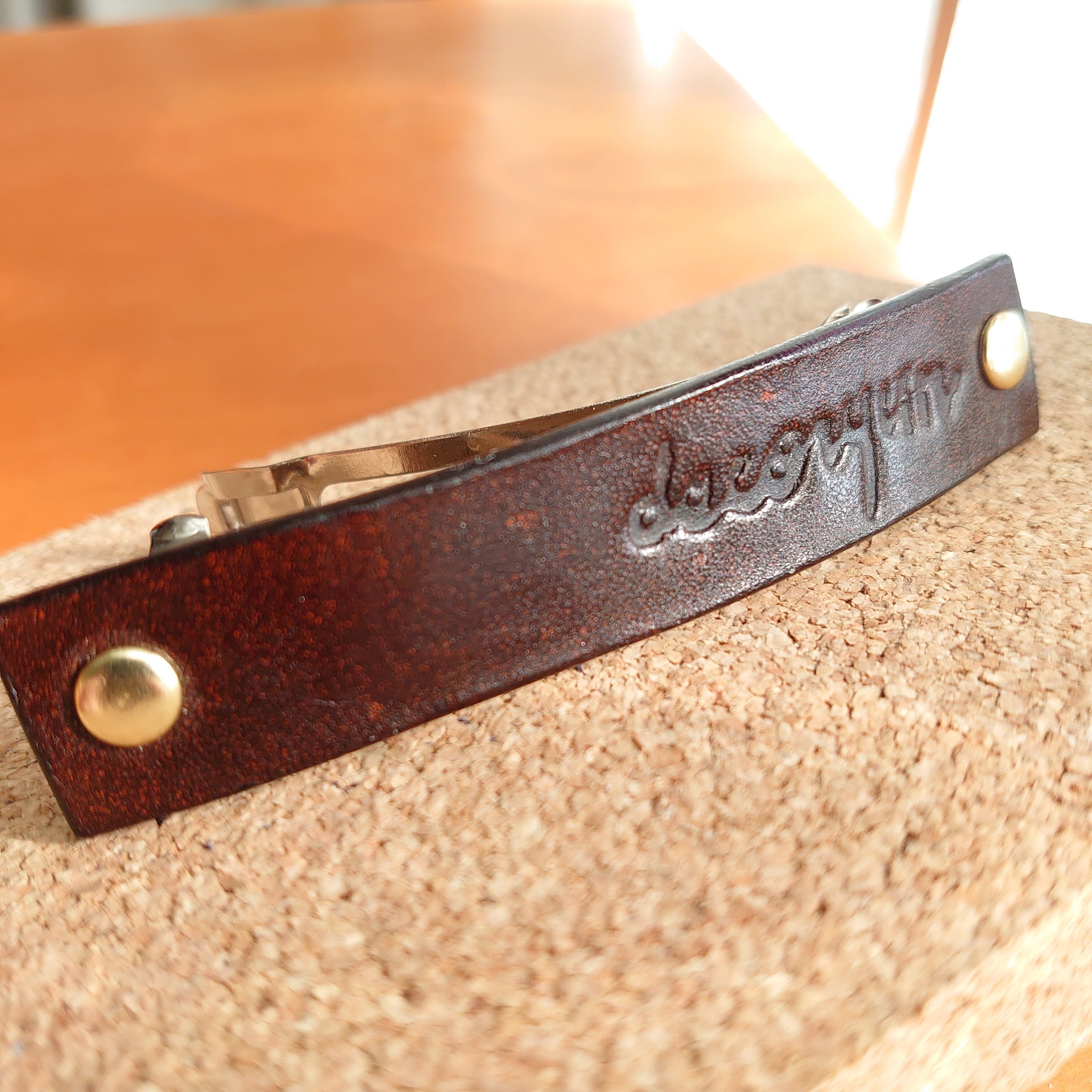 国産レザーを使用し、表面(こげ茶)は着色、裁断、磨き、刻印ともに手作りです(ブランド刻印はレジンで自作しています)。
